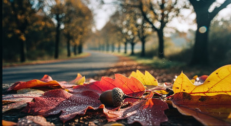 A serene autumn road enveloped by colorful foliage, offering a peaceful escape into nature. Ideal for capturing the essence of fall tranquility.