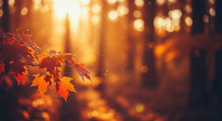 A serene autumn scene showcasing vibrant orange leaves illuminated by soft sunlight during sunset. A peaceful atmosphere perfect for nature lovers.