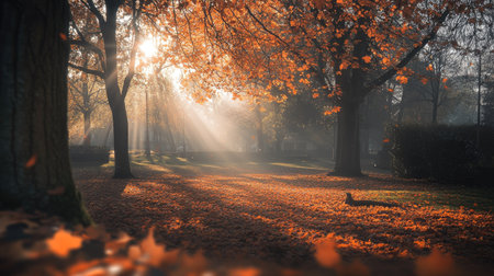Experience a peaceful autumn landscape with sunlight filtering through vibrant leaves, creating a serene atmosphere in nature during a foggy morning.