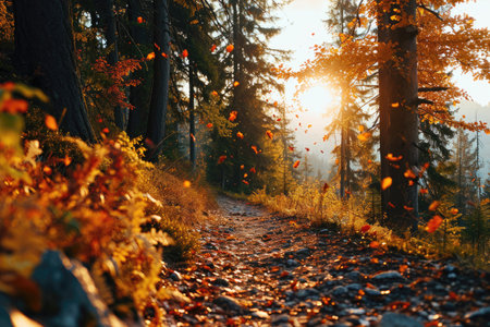 A forest path is depicted during the autumn season, with sunlight streaming through the trees. Brown leaves cover the foreground, contrasting with the green and yellow foliage. The composition and warm lighting create a peaceful scene suitable for various commercial and editorial applications.