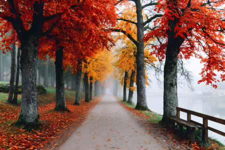 Serene pathway surrounded by vivid autumn foliage near a tranquil lake