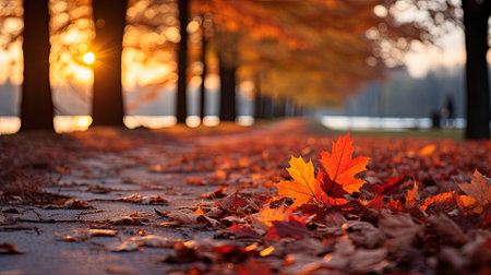 A vibrant display of golden autumn leaves blankets the ground, illuminated by the warm glow of the setting sun in a tranquil forest park.