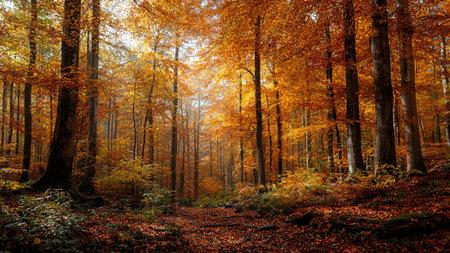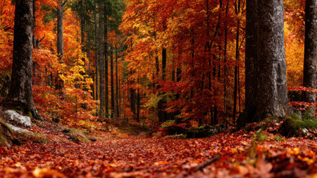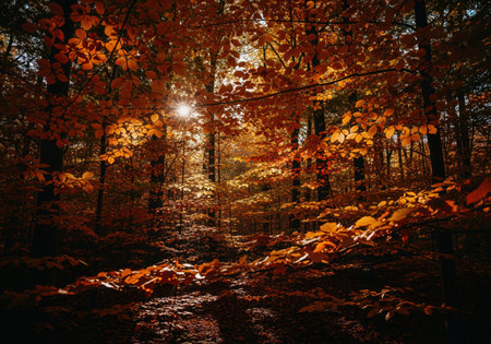 Autumn forest with vibrant red, orange, and yellow leaves covering ground, creating picturesque scene. sunlight filters through trees, enhancing warm colors and inviting tranquility