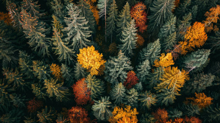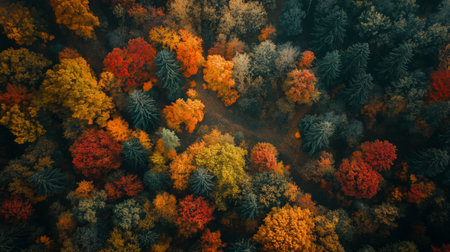 An Aerial view of vibrant autumn forest with colorful foliage and trees