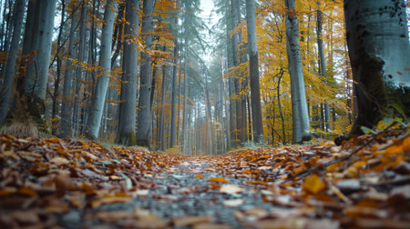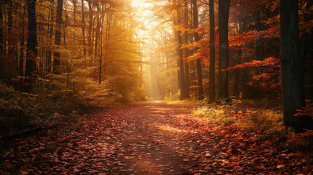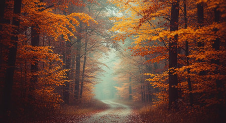 A tranquil autumn forest scene with a winding path covered in fallen orange leaves, framed by tall trees and illuminated by soft, misty natural light. Seasonal beauty and serenity.