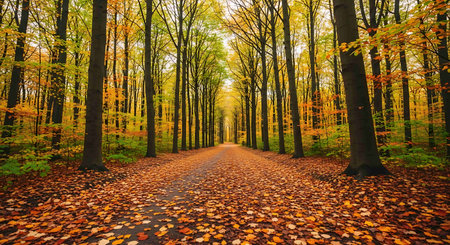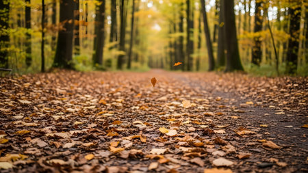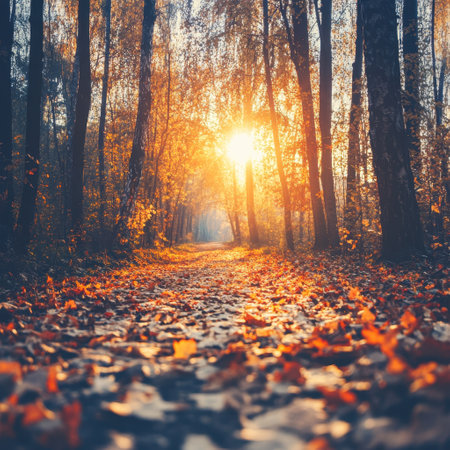 A picturesque autumn forest pathway captures the beauty of nature, showcasing vibrant fallen leaves and sunlight filtering through tall trees.