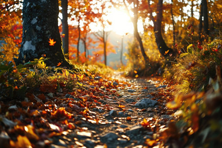 A tranquil autumn path meanders through a vibrant forest, showcasing stunning golden foliage. Perfect for those seeking nature