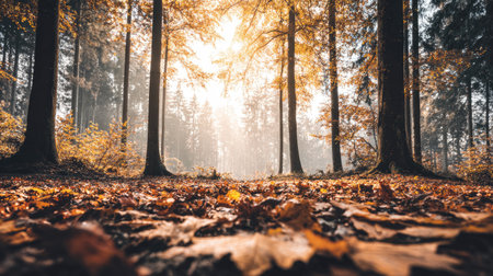 Autumn forest with fallen leaves, rich colors, seasonal warmth, copy space