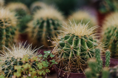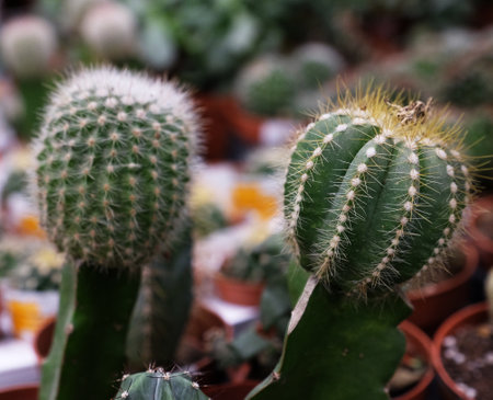 Macro photo of prickly cacti in small pots, homeplant