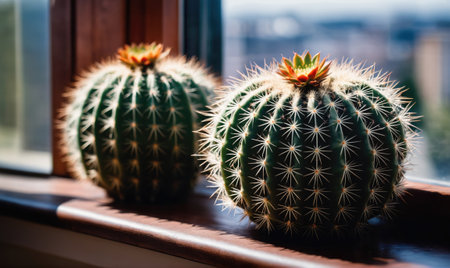 Beautiful green cactus flowers growing indoors as houseplants. Home decor, nature, and the joy of nurturing and cultivating plants indoors.