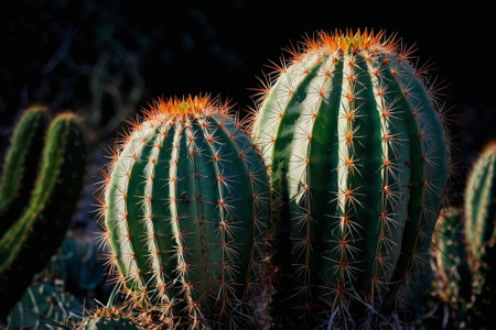 The mesmerizing beauty of a glowing cactus at sunset in the arid desert landscape, illuminated by the warm, golden hour light, showcasing the intricate details of its spines and succulent texture