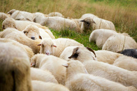 a flock of sheep rest on a meadow during transhumance