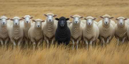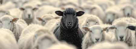 A black sheep stands out among crowd of white sheep, creating striking contrast. scene captures uniqueness and individuality in herd
