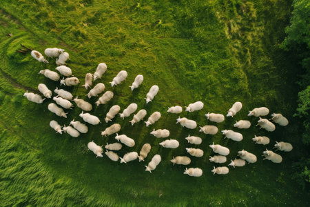 Aerial view of a flock of sheep on a green meadow