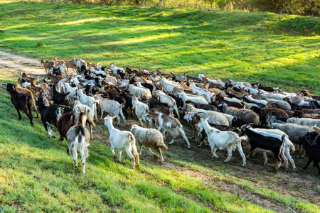 Herd of goats grazing on a green meadow in the countryside