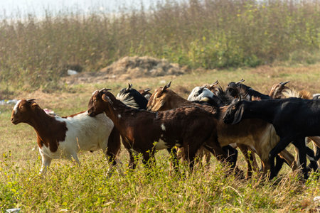 Herd of goats on pasture. Farm animal photographed on pasture in morning light