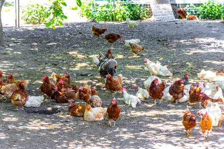 chickens at a chicken farm outdoors. Chicken farm concept.Chicken in the backyard near the chicken coop