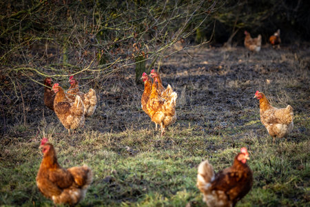 Brown Hen Farm, Chicken Laying Eggs in the Countryside, Organic Agriculture and Food Production, Surrounded by Roosters, Nature Rural Charm
