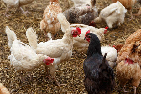 Chickens and roosters walk in the coop. White and red plumage. Rural areas, agriculture. Breeding of domestic birds.