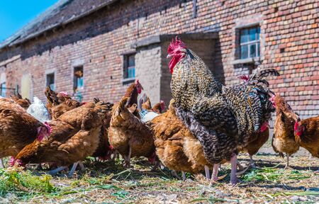 Free range organic chickens poultry in a country farm, germany
