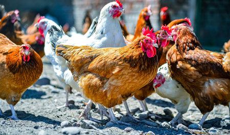 Several chickens, featuring various colors and patterns, are actively foraging on the ground in a farmyard. The environment suggests a vibrant, rural setting filled with life
