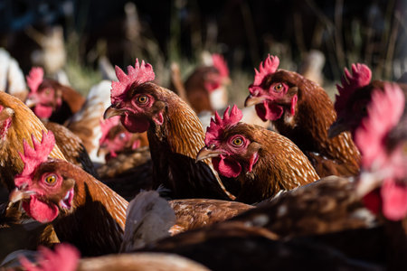 Group of brown hens in farmyard, close-up view, showcasing rural lifestyle and natural farming practices