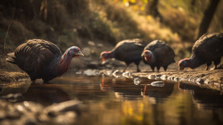 turkeys graze near the farm on a sunny day. Generative AI