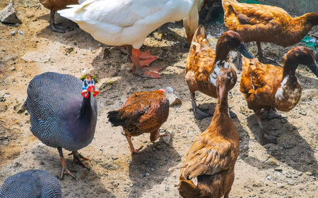 A group of guinea fowl and chicken feeding outdoor