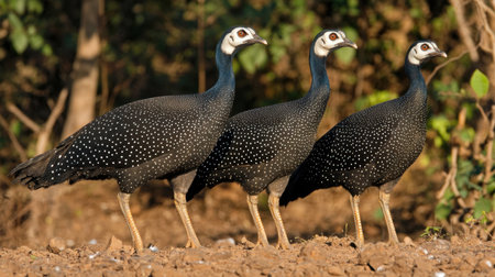 Three beautiful painted hens, or guinea chicken (Numida meleagris).