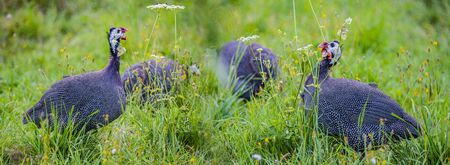 Guinea fowl birds on the grass in the park. Close-up.