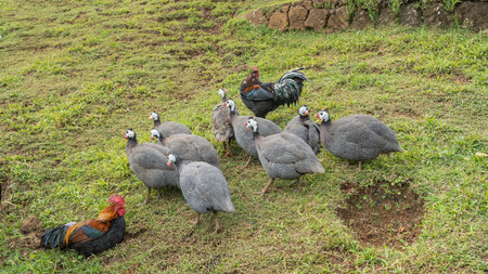Free guinea hens grazing in the farmland