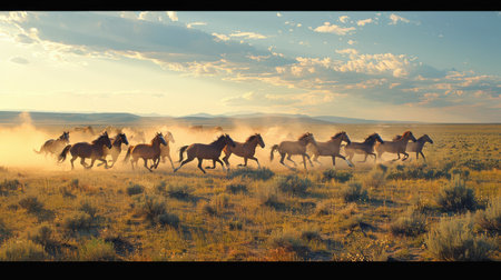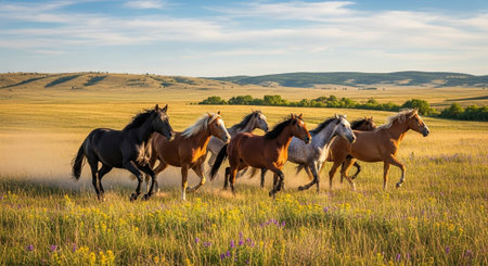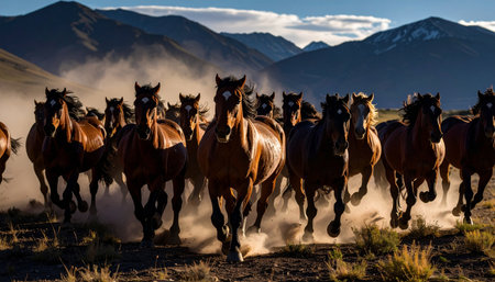 Herd of wild mustangs running on mountain prairie, dust clouds, freedom symbolism.