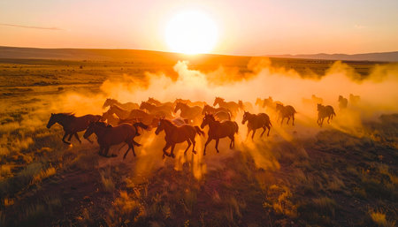 An awe-inspiring aerial view captures a herd of wild horses thundering across a dusty plain as the sun sets. The golden light illuminates the dust kicked up by their hooves, creating a powerful and cinematic scene of untamed freedom, raw energy, and the majestic spirit of the wild.
