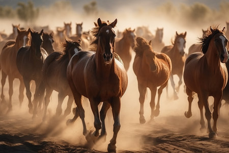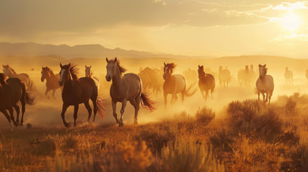 Herd of wild horses running through a field at sunset, dust in the air, dynamic movement,