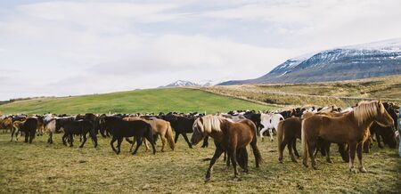 Herd of precious Icelandic horses gathered in a farm.