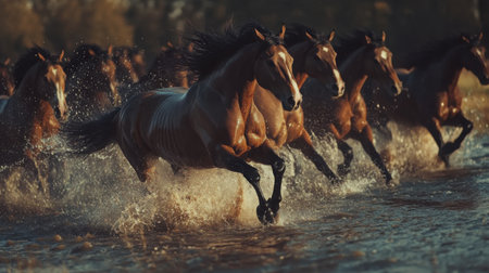 A stunning scene depicting a herd of horses galloping through shallow water, creating splashes and a misty atmosphere, embodying freedom and the beauty of nature.