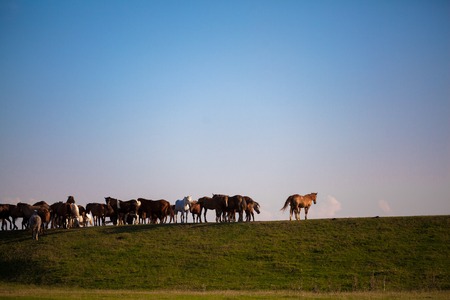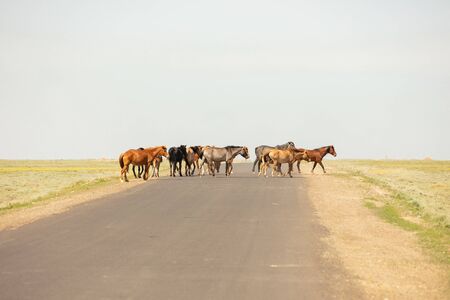 horses are on the road, behind the steppe landscape