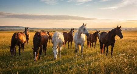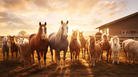 Horses of different breeds and colors gather in a sunlit pasture, exhibiting an array of striking coats. The scene captures their beauty and tranquility during late afternoon.