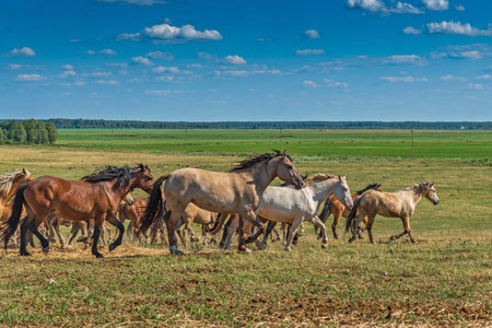 Herd of horses running on the field in autumn. Horses in motion.