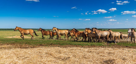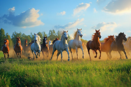 A dynamic scene depicting a herd of horses galloping through a grassy landscape, showcasing their beauty and spirit in a natural outdoor setting.