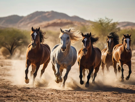 A dynamic scene of wild horses galloping through a dusty environment under a clear blue sky. The energy and freedom of these majestic animals create a vibrant image of nature and adventure.