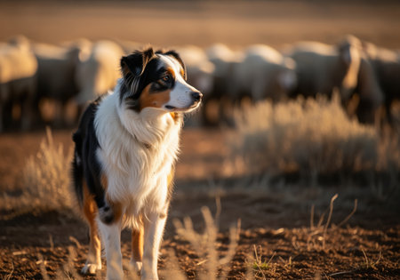 A beautiful tri color australian shepherd stands alert in a dusty field, backlit by the warm glow of the setting sun. this intelligent working dog is focused on its flock of sheep in the background.