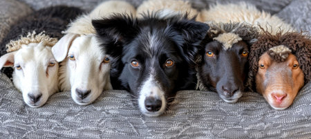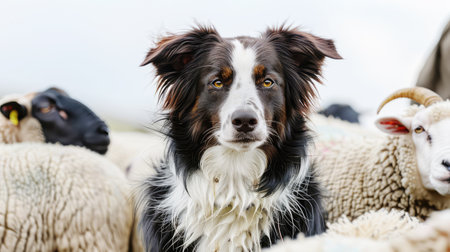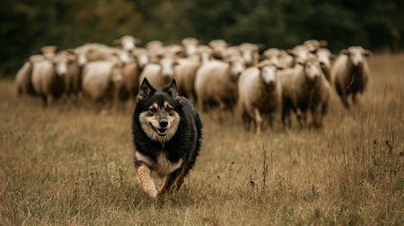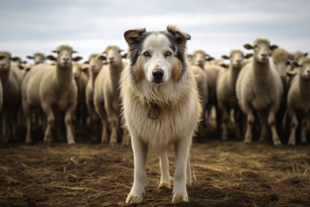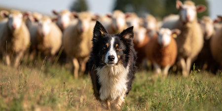 Dedicated farm dog diligently watching over a flock of sheep with unwavering attention