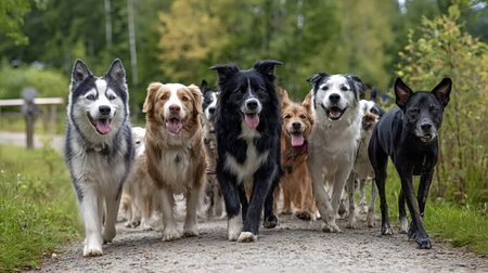 Diverse pack of happy dogs husky, border collie, golden retriever and friends walking together on a sunny park path amid trees, playful and full of joy