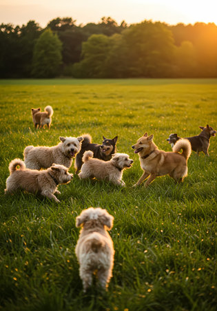 A group of five dogs, varying in size and coat color, stands confidently in a sunlit grassy field, creating a heartwarming and playful atmosphere during golden hour.