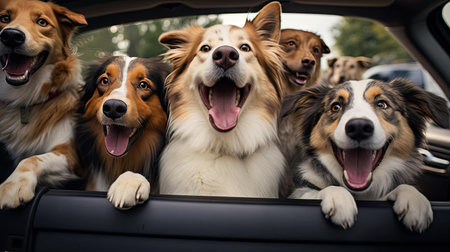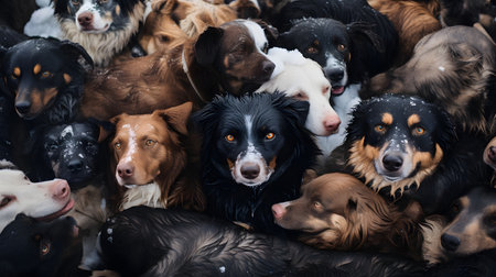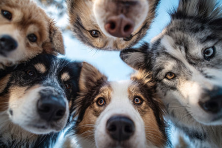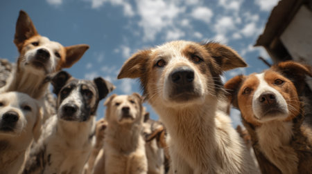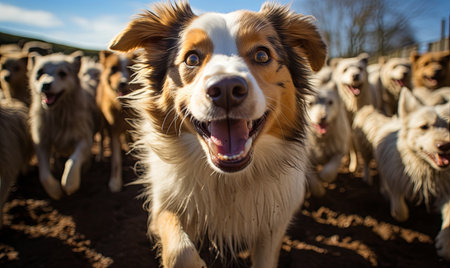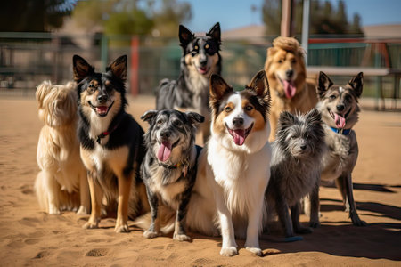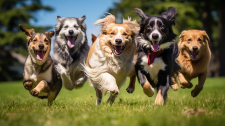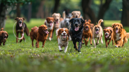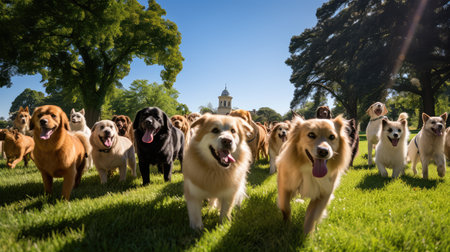 Multiple dogs of different breeds are gathered together, showing their happy expressions in a vibrant park under clear skies. Their fur colors vary, adding charm to the joyful moment.