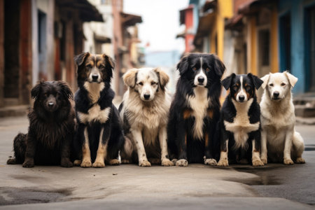 The leader of the pack, a group of stray dogs, the loneliness of a dog on the streets of the city. Concept: animal protection and a call for help to the homeless