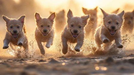 A delightful scene of playful puppies joyfully running through water, creating splashes as they enjoy a sunny day. Perfect for capturing happiness and energy.