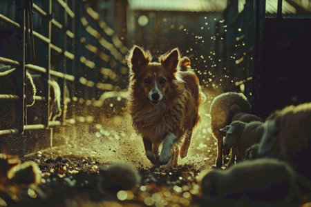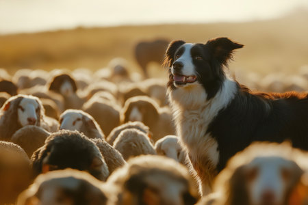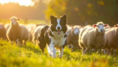 Border Collie dog herding a flock of sheep on a farm, bathed in the warm glow of the setting sun