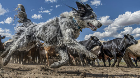 vibrant scene capturing a dog herding a herd of cattle as they run through a muddy field, creating a captivating display of movement and energy.